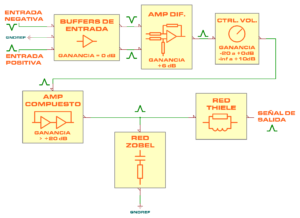 - Impedancia de salida (con redes Zobel y Thiele @ 1 kHz): < 0.02 Ω.