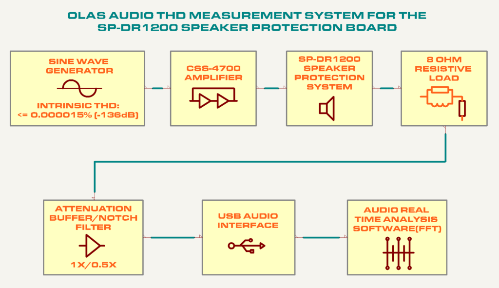Figure 5. THD measurement system for the SP-DR1200 speaker protection board.