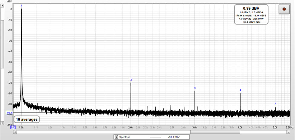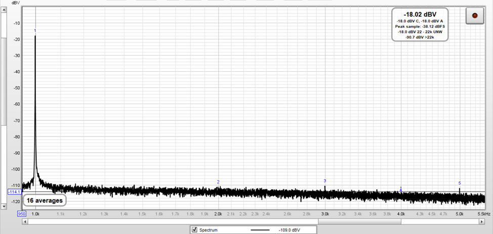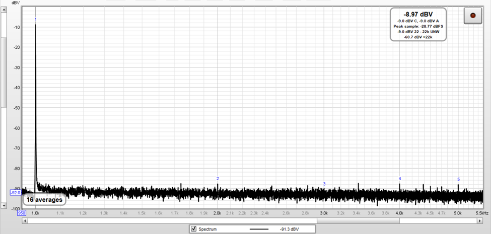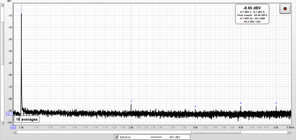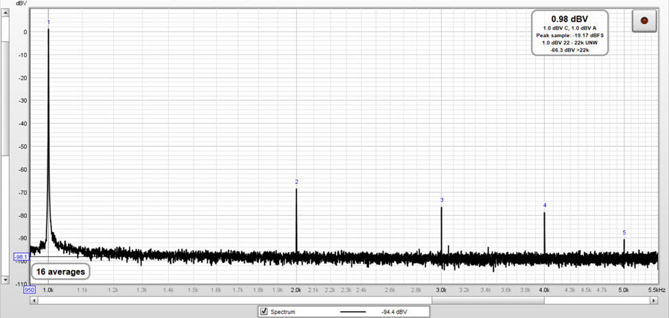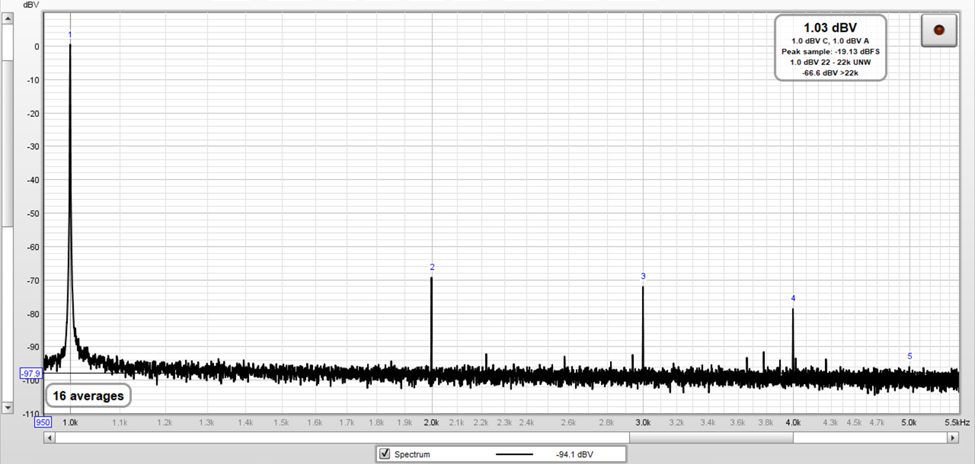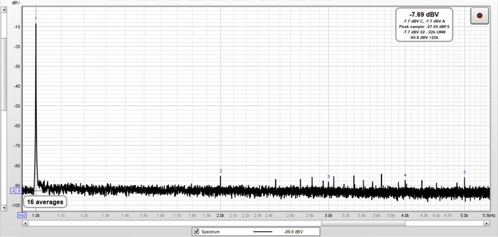 The following image corresponds to the Fourier spectrum of the test signal with an amplitude equal to 1.044 Vrms (-18.02 dBV – 40 dBV + 58.4 dBV = 0.38 dBV).